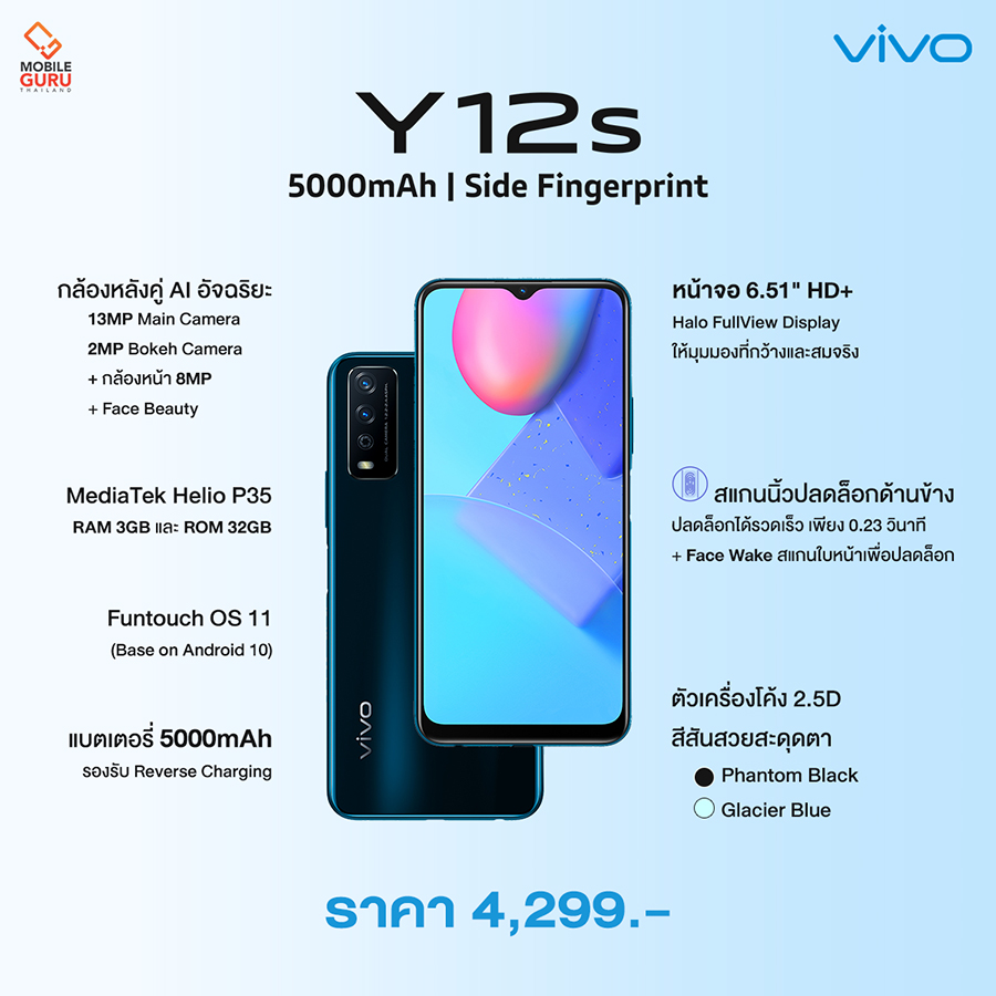Vivo Y12s มาใน 2 ตัวเลือกสีสวยงาม ได้แก่ สีดำ Phantom Black และสีฟ้าอ่อน Glacier Blue พร้อมความจำ RAM 3GB และพื้นที่ความจำภายใน 32GB วางจำหน่ายแล้ววันนี้ในราคาเพียง 4,299 บาท สามารถจับจองเป็นเจ้าของได้ที่ Vivo Brand Shop ทุกสาขา และร้านค้าตัวแทนจำหน่ายทั่วประเทศไทย