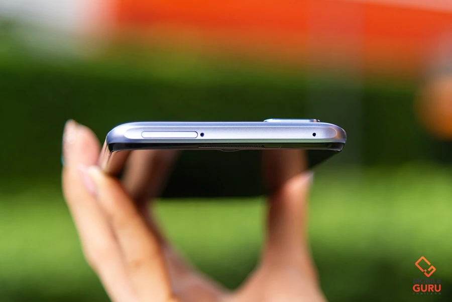 ด้านบนของตัวเครื่องมีช่องถาดซิมการ์ด โดยตัวถาดซิมการ์ดจะแบบ Hybrid slot นะครับ ดังนั้นจะต้องเลือกใช้งานระหว่างซิมการ์ดที่ 2 กับ MicroSD Card (สูงสุด 256GB)