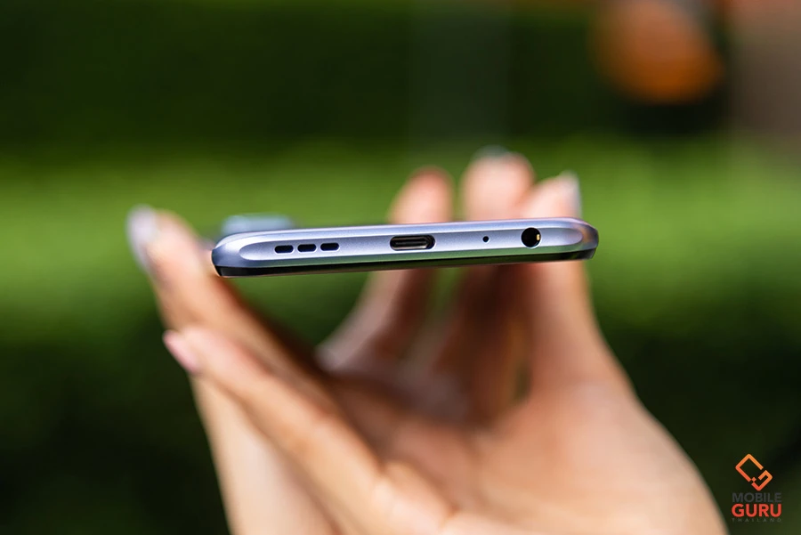 ด้านล่างของตัวเครื่องจะเป็นตำแหน่งของรูเสียบชุดหูฟังขนาด 3.5 มิลลิเมตร, พอร์ตเชื่อมต่อ USB-C และลำโพงเสียงตัวเครื่อง