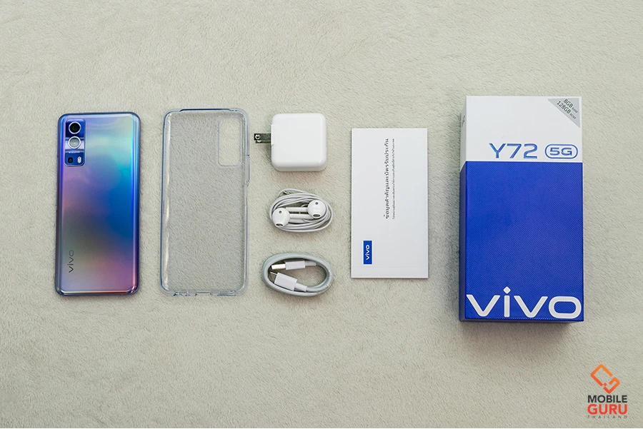 มาเริ่มกันด้วยการแกะกล่องดูของข้างในกัน สำหรับกล่องของ Vivo Y72 5G ยังคงใช้โทนสีและดีไซน์ Pattern เดียวกับกล่องของ Y Series ที่เราคุ้นเคย โดยมาในโทนสีสองสีคือฟ้าตัดขาว ด้านหน้ามีข้อความชื่อรุ่นชัดเจนว่า "Y72 5G" และเมื่อเปิดฝากล่องขึ้นมาก็จะพบกับอุปกรณ์การใช้งานพื้นฐานตามนี้