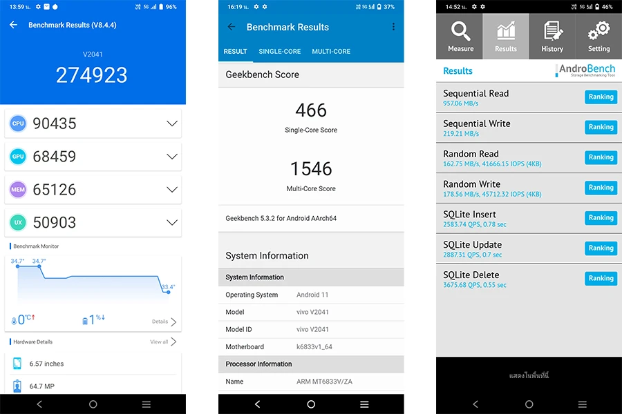 - ทดสอบประสิทธิภาพการทำงานด้วย Antutu Benchmark ได้คะแนนทดสอบ 274,923 คะแนน