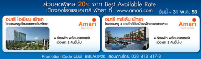 2. โปรโมชั่นส่วนลด 20% จาก Best Available Rate เมื่อจองโรงแรมอมารี พัทยา ที่ www.amari.com