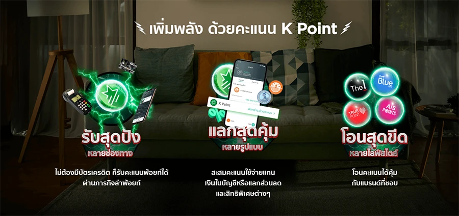 คะแนนสะสม : "K Point" เป็นคะแนนที่ลูกค้าได้รับจากธนาคาร ผ่านการใช้ผลิตภัณฑ์/บริการ ตามที่ธนาคารกำหนด เช่น การใช้จ่ายผ่านบัตรเครดิตกสิกรไทย, การเข้าร่วมภารกิจ (Mission) และทำตามเงื่อนไขที่ธนาคารกำหนดสำเร็จ โดยลูกค้าจะได้รับคะแนนตามเงื่อนไขของแต่ละผลิตภัณฑ์/บริการตามแต่ละโครงการ หรือรายการส่งเสริมการขาย/การตลาด แล้วแต่กรณีตามที่ธนาคารจะแจ้งให้ทราบ ปัจจุบัน K Point เป็นคะแนนเฉพาะ KBank แต่ในอนาคตอาจรวมถึงคะแนนที่ได้จากกลุ่มธุรกิจธนาคารกสิกรไทยด้วย