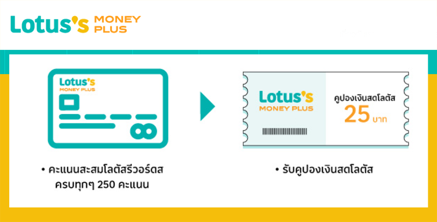 - คะแนนสะสมโลตัส รีวอร์ดสของท่านทุกๆ 250 คะแนน จะเปลี่ยนเป็นคูปองเงินสดโลตัสมูลค่า 25 บาท