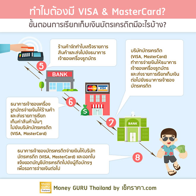 - Step 8 : บริษัทบัตรเครดิต (VISA, MasterCard) จะจ่ายเงินให้กับธนาคารเจ้าของเครื่องรูดบัตรฯ และส่งรายการเรียกเก็บเงินต่อไปยังสถาบันการเงินเจ้าของบัตรเครดิต