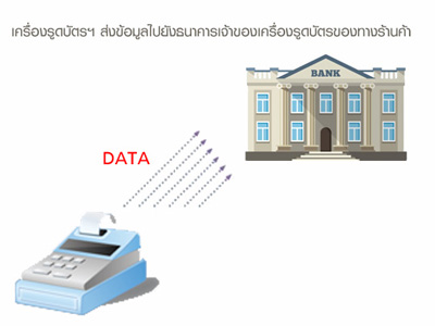 - Step 3 : ธนาคารเจ้าของเครื่องรูดบัตรฯ จะตรวจสอบรายการและส่งรายละเอียดการซื้อสินค้าไปยังบริษัทบัตรเครดิต (VISA, MasterCard)