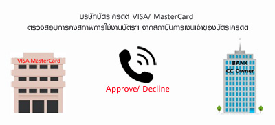 - Step 4 : บริษัทบัตรเครดิต (VISA, MasterCard) จะติดต่อไปยังสถาบันการเงินเจ้าของบัตรเครดิต เพื่อตรวจสอบว่าบัตรฯ ยังคงสภาพการใช้งานอยู่หรือไม่ และมีวงเงินเพียงพอหรือเปล่า?