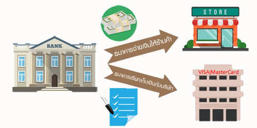 - Step 7 : จากนั้นธนาคารเจ้าของเครื่องรูดบัตรฯ ก็จะจ่ายเงินให้กับร้านค้า และในขณะเดียวกันก็จะส่งรายการเรียกเก็บค่าสินค้านั้นต่อไปยังบริษัทบัตรเครดิต (VISA, MasterCard) เช่นเดียวกัน