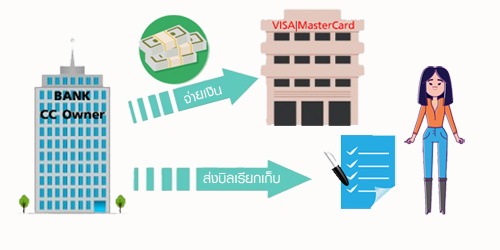 ข้างต้นคือ กระบวนการทำงานของบัตรเครดิต ณ ขณะที่เรากำลังยืนรอเพื่อเซ็น Slip อย่างสบายใจ (ไม่ถึง 10 วินาที) จะเห็นว่าขั้นตอนการทำงานภายในระบบค่อนข้างซับซ้อน แต่ก็พอมองเห็นภาพกันใช่มั้ยคะ? ต่อไปจะเป็นขั้นตอนการเรียกเก็บเงินเมื่อมีการรูดซื้อสินค้า ลองไปดูต่อกันเลยดีกว่าค่ะ
