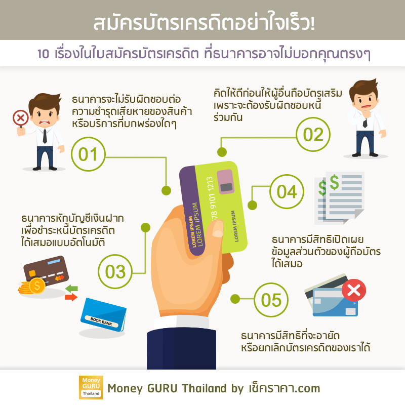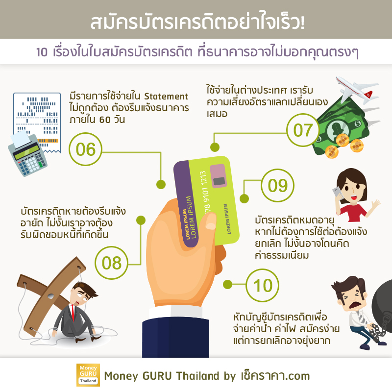 เชื่อว่าหลายๆ คน ทั้งที่มีบัตรเครดิตอยู่แล้ว หรือกำลังคิดอยากจะสมัครบัตรเครดิตอยู่นั้น อาจยังไม่รู้ข้อมูลบัตรเครดิต รวมถึงรายละเอียดลึกๆ ที่แต่ละสถาบันการเงินได้กำหนดไว้ในใบสมัครบัตรเครดิต เกี่ยวกับข้อตกลงและเงื่อนไขในการใช้บัตรเครดิต ซึ่งหากเราจะสมัครบัตรเครดิตนั้นจะต้องยอมรับในข้อตกลงและเงื่อนไขต่างๆ ให้ได้ทุกข้อ และจะต้องปฏิบัติตามไปตลอดตราบใดที่เรายังถือบัตรเครดิตอยู่ค่ะ วันนี้ทีมงาน CheckRaka.com ของเรา ก็ได้สรุปเกี่ยวกับข้อตกลงในใบสมัครบัตรเครดิตที่เราควรรู้ มาให้เพื่อนๆ ได้ดูกันประมาณ 10 ข้อใหญ่ๆ ดังต่อไปนี้ค่ะ