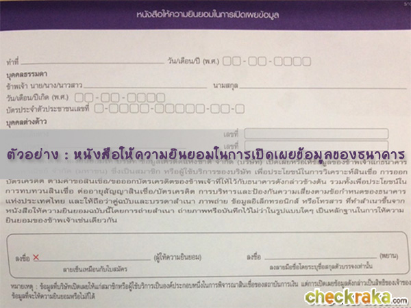 ในรายละเอียดของใบสมัครบัตรเครดิต จะมีข้อมูลที่เราจำเป็นต้องกรอกอยู่ที่ส่วนเกือบสุดท้าย และถือว่าเป็นส่วนที่สำคัญที่สุดในการสมัครบัตรเครดิต นั่นก็คือ "หนังสือให้ความยินยอมในการเปิดเผยข้อมูล" และเมื่อได้ทำการกรอกข้อมูลลงไปแล้ว หมายความว่าเราได้แสดงความยินยอมให้ทำการเปิดเผยข้อมูล ทั้งข้อมูลส่วนตัว ฐานะทางการเงินต่างๆ ให้แก่ธนาคารเจ้าของบัตรฯ สามารถทำการติดต่อสอบถามได้ และยังรวมไปถึงกลุ่มนิติบุคคลอื่นๆ ที่ธนาคารอนุญาตให้ติดต่อเราได้อีกด้วย