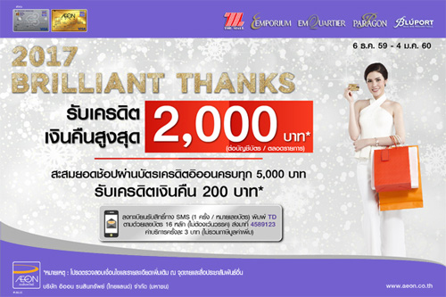 ![]() AEON | ![]() สถานที่ร่วมรายการ : ห้างสรรพสินค้าเดอะมอลล์ ทุกสาขา, เอ็มโพเรียม, เอ็มควอเทียร์, พารากอน และบลูพอร์ต (ยกเว้นร้านค้าเช่าภายในศูนย์การค้า) ระยะเวลาโปรโมชั่น : วันที่ 6 ธ.ค. 59 - 4 ม.ค. 60 |