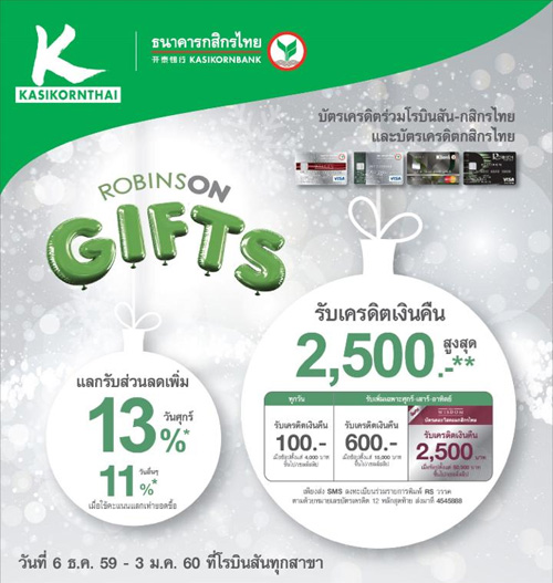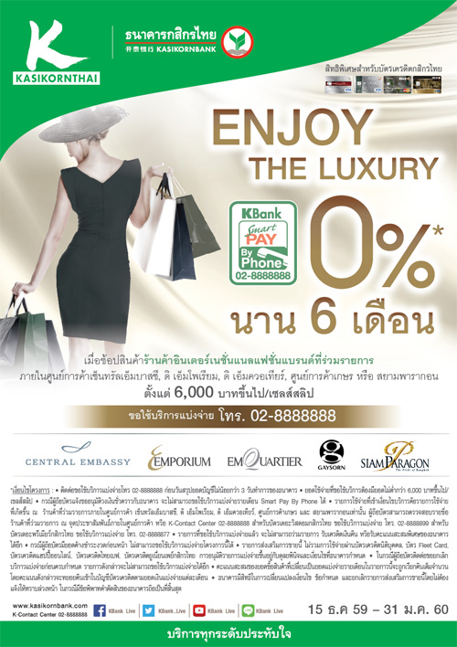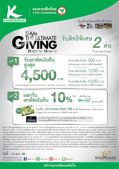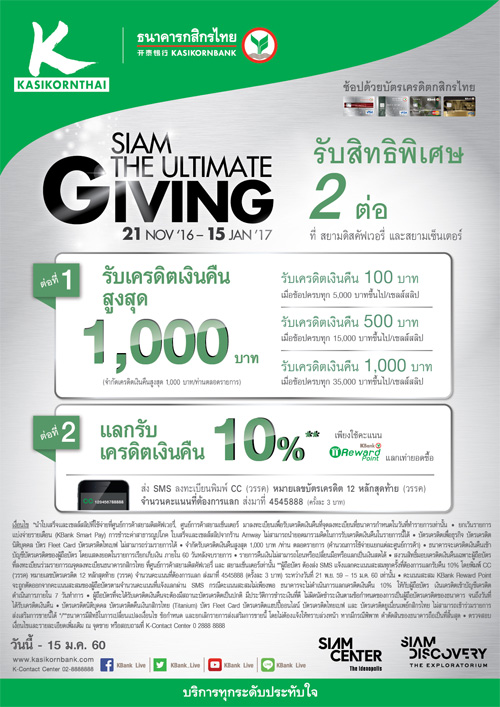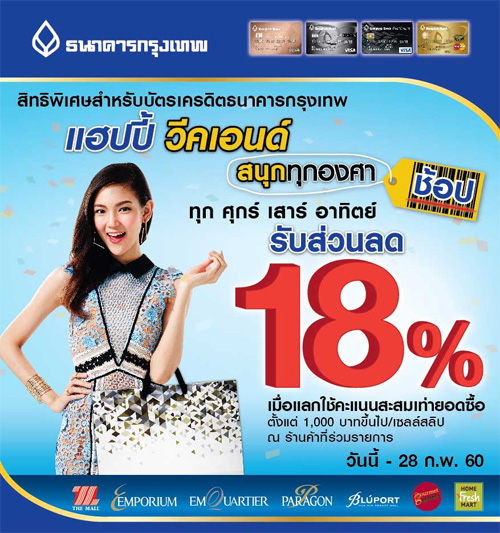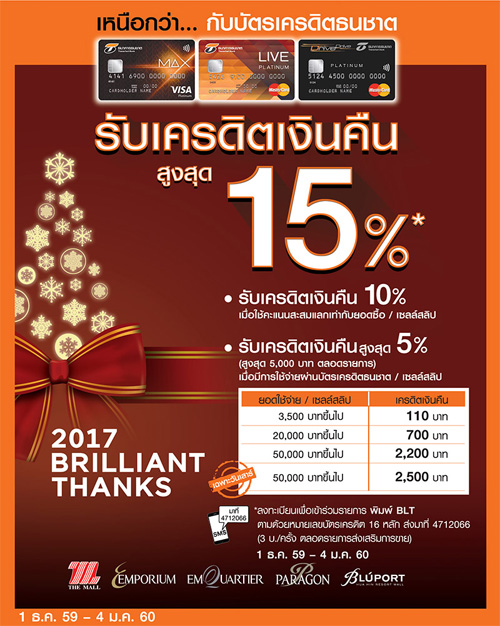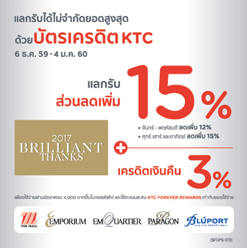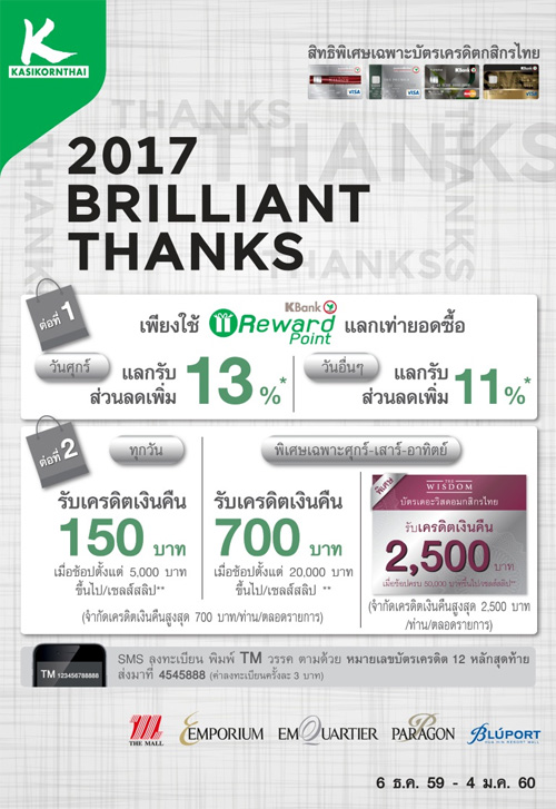 ![]() KBANK | ![]() สถานที่ร่วมรายการ : เดอะมอลล์, เอ็มโพเรียม, เอ็มควอเทียร์, พารากอน และบลูพอร์ต ระยะเวลาโปรโมชั่น : วันนี้ - 4 ม.ค. 60 |