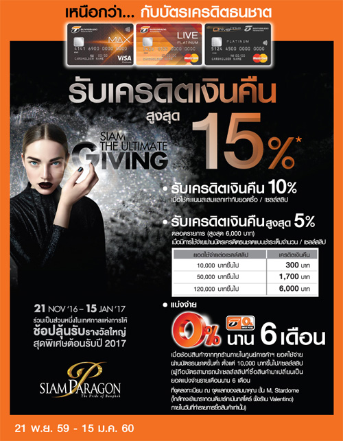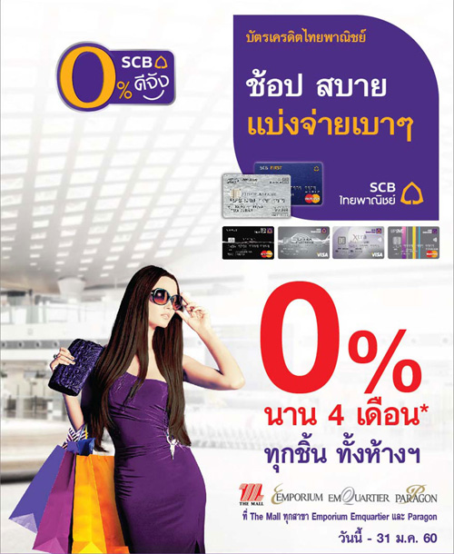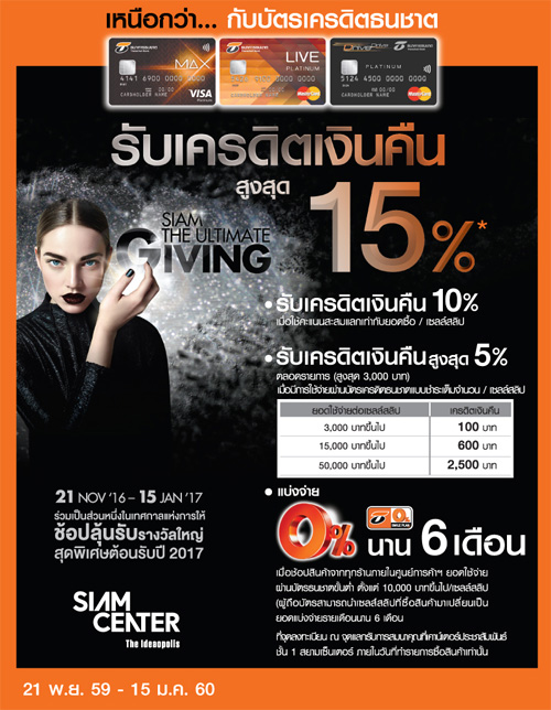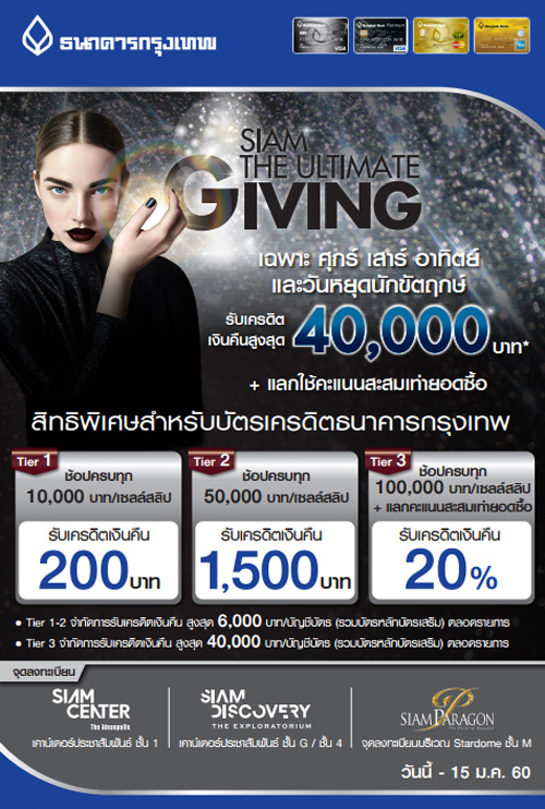 ![]() CIMB THAI | ![]() สถานที่ร่วมรายการ : สยามพารากอน, สยามเซ็นเตอร์, สยามดิสคัฟเวอรี่, พาราไดซ์ พาร์ค, เดอะมอลล์, เอ็มโพเรียม, เอ็มควอเทียร์, พารากอน และบลูพอร์ต ระยะเวลาโปรโมชั่น : วันนี้ - 31 ม.ค. 60 |