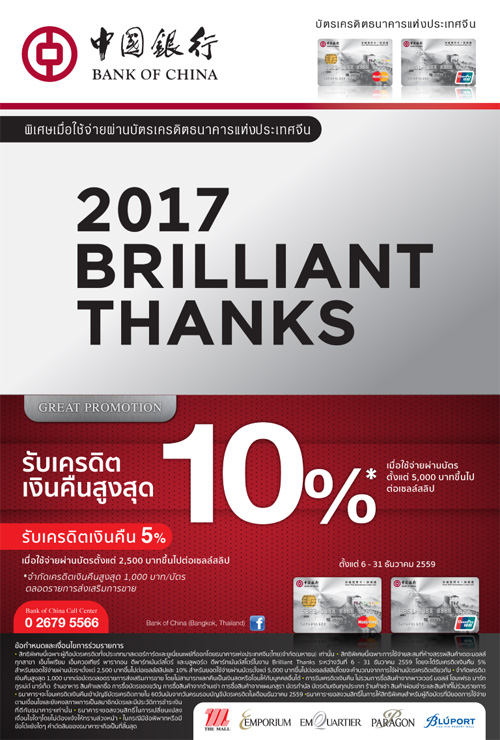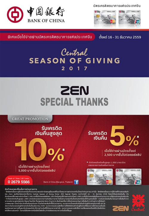 ![]() Bank of China | ![]() สถานที่ร่วมรายการ : Central ทุกสาขา และเซน ระยะเวลาโปรโมชั่น : วันนี้ - 31 ธ.ค. 59 |