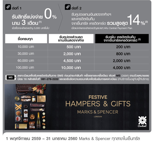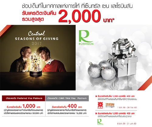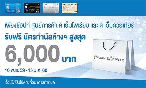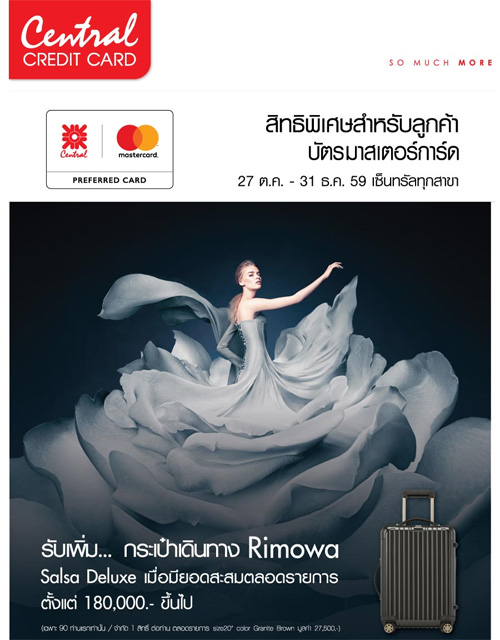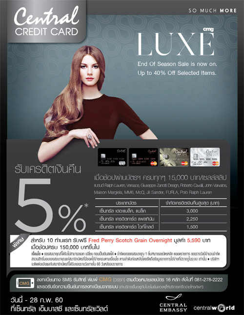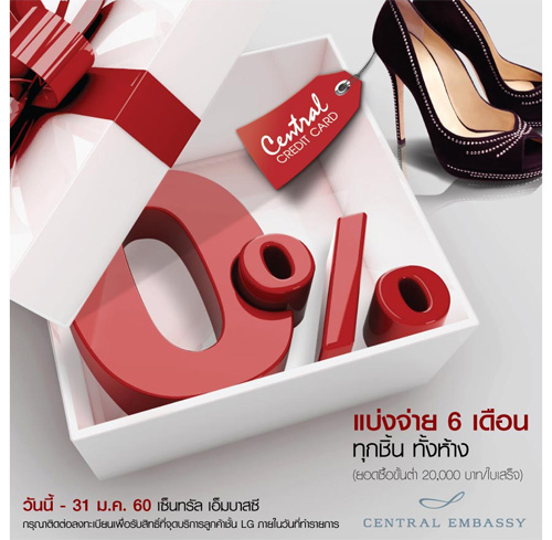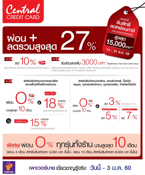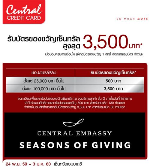 ![]() Central Card, ![]() Simple Visa Card | ![]() สถานที่ร่วมรายการ : Central Embassy ระยะเวลาโปรโมชั่น : วันนี้ - 3 ม.ค. 60 |