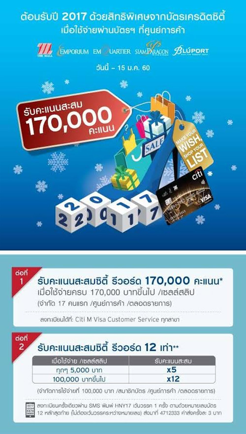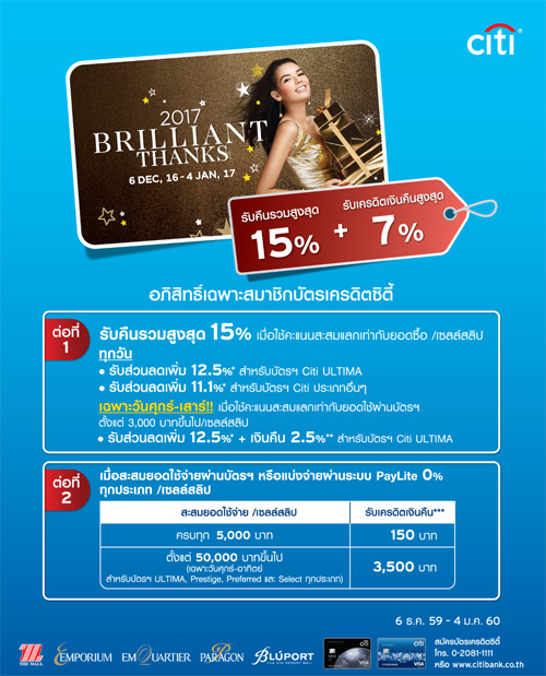 ![]() Citibank | ![]() สถานที่ร่วมรายการ : เดอะมอลล์, เอ็มโพเรียม, เอ็มควอเทียร์, พารากอน, บลูพอร์ต ระยะเวลาโปรโมชั่น : วันนี้ - 4 ม.ค. 60 |