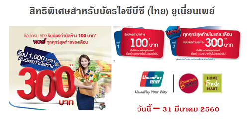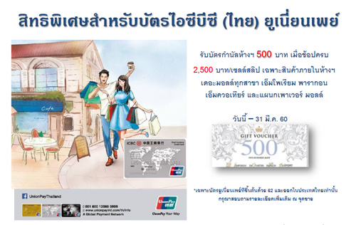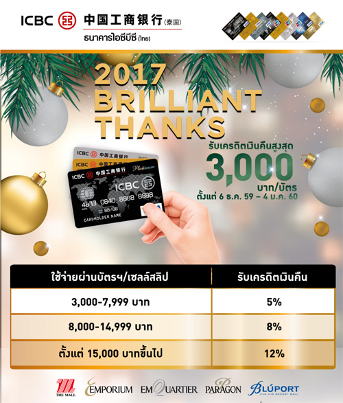 ![]() ICBC THAI | ![]() สถานที่ร่วมรายการ : เดอะมอลล์, เอ็มโพเรียม, เอ็มควอเทียร์, พารากอน และบลูพอร์ต ระยะเวลาโปรโมชั่น : วันนี้ - 4 ม.ค. 60 |