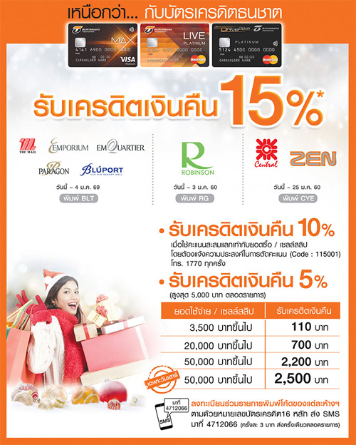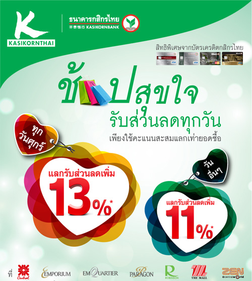 - เป็นโปรโมชั่นที่เน้นในเรื่องของการได้รับสิทธิพิเศษเพิ่มเติมจากการช้อปผ่านบัตรเครดิต ที่เจ้าของบัตรเครดิตแต่ละเจ้าได้จัดรายการร่วมกับศูนย์การค้า และห้างสรรพสินค้าชั้นนำหลักๆ 2 กลุ่ม คือ กลุ่มเดอะมอลล์ และกลุ่มเซ็นทรัล