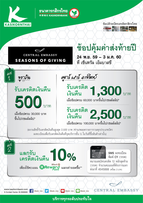 ![]() KBANK | ![]() สถานที่ร่วมรายการ : เซ็นทรัล เอ็มบาสซี ระยะเวลาโปรโมชั่น : วันนี้ - 3 ม.ค. 60 |
