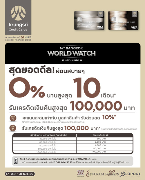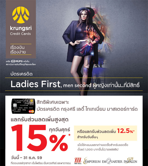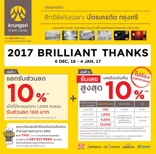 ![]() Krungsri | ![]() สถานที่ร่วมรายการ : เดอะมอลล์, เอ็มโพเรียม, เอ็มควอเทียร์ พารากอน และบลูพอร์ต หัวหิน ระยะเวลาโปรโมชั่น : วันนี้ - 4 ม.ค. 60 |
