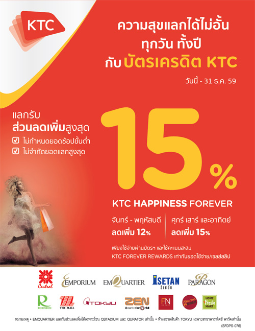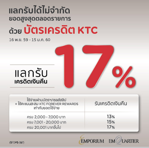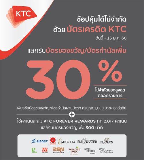 ![]() KTC | ![]() สถานที่ร่วมรายการ : เดอะมอลล์, เอ็มโพเรียม, เอ็มควอเทียร์, พารากอน, บลูพอร์ต, สยามเซ็นเตอร์ และสยามดิสคัฟเวอรี่ ระยะเวลาโปรโมชั่น : วันนี้ - 15 ม.ค. 60 |