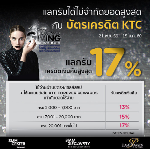 ![]() สถานที่ร่วมรายการ : Siam Center, Siam Discovery ระยะเวลาโปรโมชั่น : วันนี้ - 15 ม.ค. 60 | |