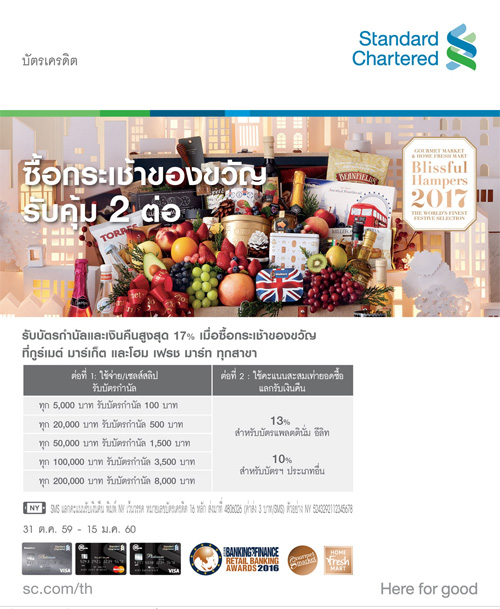 ![]() Standard Chartered | ![]() สถานที่ร่วมรายการ : Gourmet Market, Home Fresh Mart ระยะเวลาโปรโมชั่น : วันนี้ - 15 ม.ค. 60 |