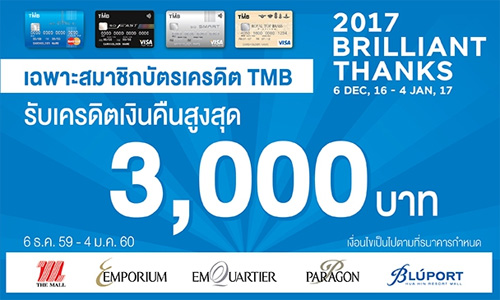 ![]() TMB | ![]() สถานที่ร่วมรายการ : เดอะมอลล์, เอ็มโพเรียม, เอ็มควอเทียร์ พารากอน และบลูพอร์ต ระยะเวลาโปรโมชั่น : วันนี้ - 4 ม.ค. 60 |