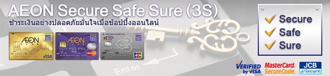 บริการ Verified by Visa, MasterCard Securecode, JCB J/Secure ของ AEON คือ บริการชำระเงินออนไลน์ที่มีระบบรักษาความปลอดภัยตามมาตรฐานสากล มอบความอบอุ่นใจให้คุณมากยิ่งขึ้นทุกครั้งที่ช้อปออนไลน์ด้วยบัตรเครดิต AEON