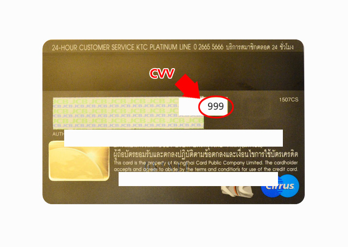 | หมายเหตุ : ตำแหน่งของรหัส CVV ที่อยู่บนบัตรจะแตกต่างกันออกไปตามประเภทของบัตรเครดิต คือ ถ้าเป็นบัตรเครดิตประเภท VISA และ MasterCard จะมีจำนวน 3 หลัก อยู่ด้านหลังบัตรบริเวณช่องลายเซ็น ส่วนบัตรเครดิต American Express นั้นจะมี 4 หลัก อยู่ด้านหน้าบัตรบริเวณมุมบนด้านขวาหรือซ้ายของหมายเลขบัตรเครดิต |