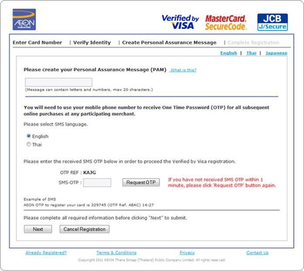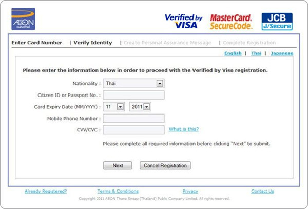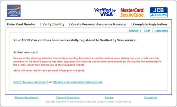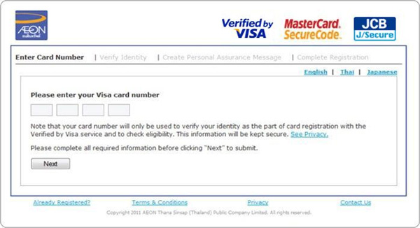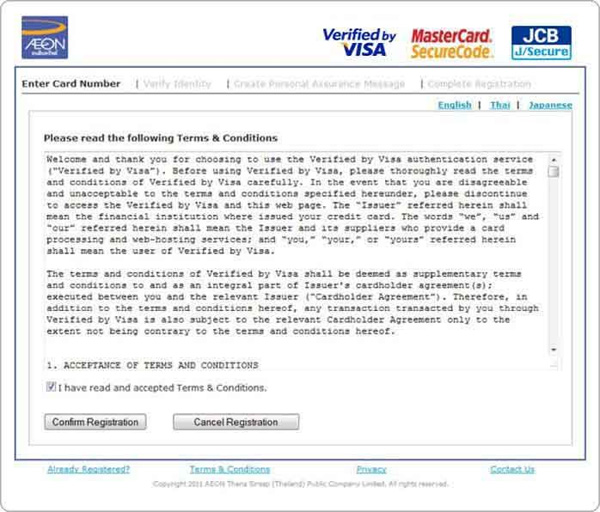 - ลงทะเบียนบริการ Secure Online Payment (Verified by Visa, MasterCard Securecode, JCB J/Secure) ให้กับบัตร AEON ของคุณโดยรหัสผ่าน และข้อความส่วนตัวของคุณเอง