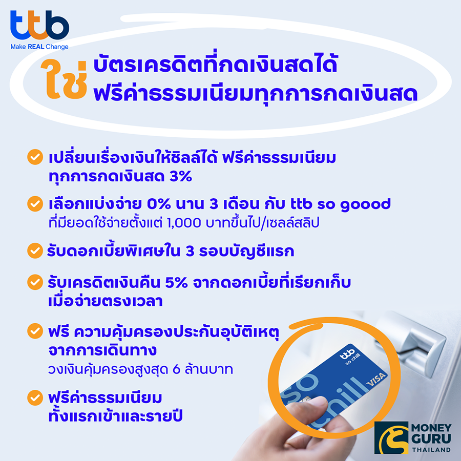 หากพูดถึงการกดเงินสดจากบัตรเครดิต หลายคนก็น่าจะทราบกันดีอยู่แล้วว่าจะมีค่าธรรมเนียมการกดเงินสด 3% และ vat อีก 7% แต่นาทีนี้ หากคุณเลือกใช้ "บัตรเครดิต ttb so chill (ทีทีบี โซชิลล์)" จะช่วยให้คุณชิลล์ได้สมชื่อ เพราะคุณสามารถกดเงินสดจากบัตรเครดิตใบนี้ได้แบบฟรีๆ โดยไม่มีค่าธรรมเนียมกันเลย แถมยังมีสิทธิประโยชน์อื่นๆ ที่น่าสนใจอีกเพียบ