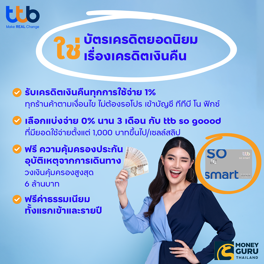 สำหรับคนที่ชอบความคุ้มค่า "บัตรเครดิต ttb so smart (ทีทีบี โซสมาร์ท)" เป็นบัตรเครดิต cashback ที่สามารถตอบโจทย์คุณได้ เพราะคุณจะได้รับเครดิตเงินคืนจากทุกๆ การใช้จ่าย 1% จากทุกร้านค้า ตามเงื่อนไข โดยธนาคารจะคืนเงินเข้าบัญชี ทีทีบี โน ฟิกซ์ โดยที่ไม่ต้องรอโปรโมชันกันเลย