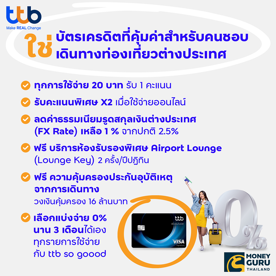 หากคุณเป็นสายเที่ยว รักการเดินทาง ชอบเดินทางไปต่างประเทศบ่อยๆ "บัตรเครดิต ttb absolute (ทีทีบี แอปโซลูท)" เป็นบัตรเครดิตท่องเที่ยวต่าางประเทศ ที่ช่วยให้คุณคุ้มค่ายิ่งกว่า เมื่อใช้จ่ายด้วยสกุลเงินต่างประเทศ โดยลดค่าธรรมเนียมจากการแปลงสกุลเงินต่างประเทศ (FX Rate) เหลือเพียง 1% จากปกติ 2.5% และยังได้รับสิทธิ์ใช้ห้องรับรองพิเศษ Airport Lounge (Lounge Key) 2 ครั้ง/ปีปฎิทิน