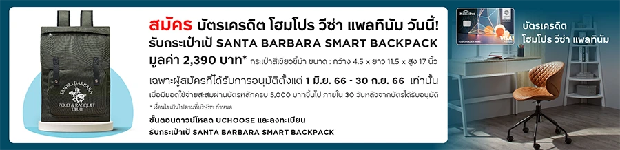สิทธิพิเศษเฉพาะผู้ที่สมัครบัตรหลัก และได้รับการอนุมัติตั้งแต่ 1 มิ.ย. 66 - 30 ก.ย. 66 จะได้รับกระเป๋าเป้ SANTA BARBARA SMART BACKPACK จำนวน 1 ใบ มูลค่า 2,390 บาท เมื่อมียอดใช้จ่ายผ่านบัตรหลักครบ 5,000 บาทขึ้นไป พร้อมทั้งลงทะเบียนเข้าร่วมแคมเปญผ่านแอปพลิเคชัน UCHOOSE (ค้นหาพิมพ์ "KC2" ในหน้าเมนูโปรโมชั่น) ภายใน 30 วันหลังจากบัตรได้รับการอนุมัติ