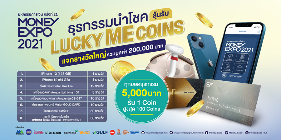 - กิจกรรมธุรกรรมนำโชค เป็นกิจกรรมสำหรับผู้เข้าชมงานที่ทำธุรกรรมภายในงาน Money Expo2021 ที่มียอดธุรกรรมตั้งแต่ 5,000 บาท ขึ้นไป โดยจะได้ลุ้นรับ Lucky ME Coins ซึ่งสามารถร่วมกิจกรรมและสุ่มผู้โชคดีผ่านทาง Application MoneyExpoPlus+