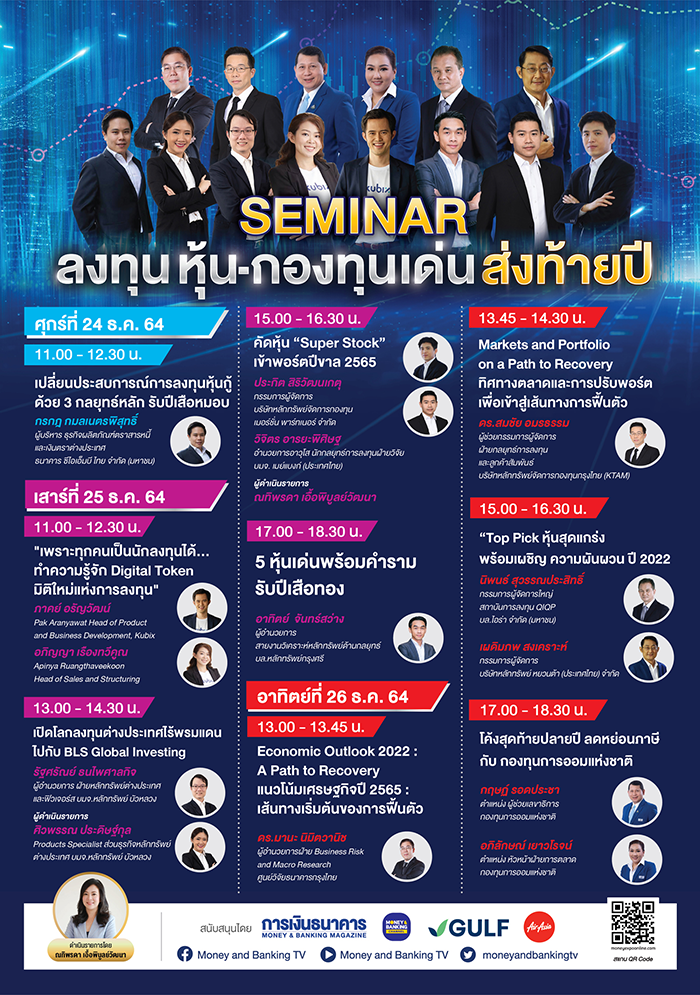 - กิจกรรมสัมมนา เพื่อให้ความรู้ทางการเงินการลงทุน โดยวิทยากรผู้เชี่ยวชาญในตลาดเงินและตลาดทุนแก่ผู้เข้าชมงานวันละหลายรอบ ตลอดการจัดงาน 4 วัน ซึ่งภายในห้องสัมมนาจัดในรูปแบบรักษาระยะห่างระหว่างบุคคล (Social Distancing) และสามารถรับชม LIVE ผ่านทางแฟนเพจ Money and Banking Channel และ การเงินธนาคาร