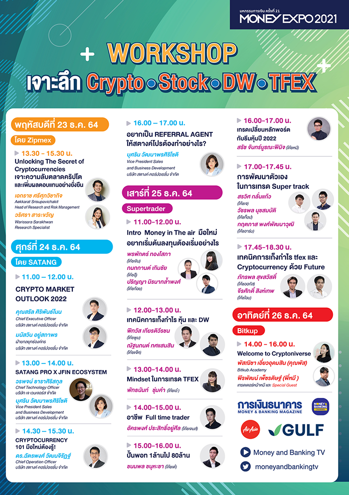 - กิจกรรมเวิร์กช็อป เจาะลึกการลงทุนใน Cryptocurrency ที่กำลังร้อนแรงและได้รับความสนใจจากนักลงทุนเป็นอย่างมาก จาก Top 3 ตลาดสินทรัพย์ดิจิทัลของไทย