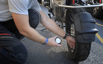 ความดันลมยางควรตรวจลมยางให้พอดีกับน้ำหนัก และข้อกำหนดที่บอกไว้กับยางมอเตอร์ไซค์ที่ใช้ และควรตรวจวัดความดันลมทุกครั้งที่ออกเดินทางไกล หรือตรวจความดันลมยางทุกสัปดาห์ การตรวจวัดลมยางควรทำขณะที่ยางยังเย็นอยู่ เพราะหากทำขณะที่ยางมีความร้อน อากาศภายในยางจะขยายตัวทำให้ค่าผิดเพี้ยนไป ถ้าความดันลมยางมากเกิน หน้ายางจะสัมผัสกับถนนได้น้อย ทำให้มีการสะเทือนของล้อมากกว่าปกติ และทำให้การยึดเกาะถนนน้อยลง ซึ่งอาจทำให้เกิดอันตรายได้ แต่ถ้าความดันลมยางน้อยเกิน ยางจะแบน หน้ายางจะสัมผัสกับพื้นถนนมาก ยางจะสึกหรอเร็ว และเปลืองน้ำมันมากขึ้น การเติมลมยางที่พอดีตามข้อกำหนด จะทำให้ขับขี่ปลอดภัยและช่วยยืดอายุของยางให้ใช้งานได้นานขึ้น