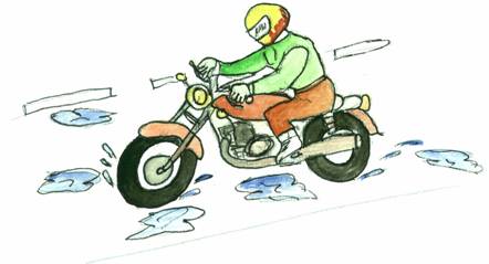 ถนนมีหลุมลึก - หาหจำเป็นต้องขับขี่ผ่านหลูมลึกหรือผิวถนนที่ขระขระมากๆ ควรยืมขึ้นในลักษณะย่อเข่าเล็กน้อย พร้อมทั้งโยกตัวไปในทิศทางตรงกันข้ามกับระดับตัวรถที่เอียงเมื่อขับผ่านหลุมหรือเนินต่างๆ จะช่วยให้ควบคุมรถได้ดีกว่าการนั่ง