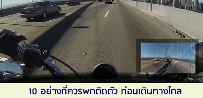 การเดินทางไกลนั้นอุปกรณ์บางอย่างก็จำเป็นมาก-น้อยแตกต่างกัน แต่จะมีความสำคัญมากที่สุดเมื่อเกิดเหตุฉุกเฉิน ดังนั้น การขับรถไปต่างจังหวัด หรือระยะทางไกลๆ ย่อมมีความเสี่ยงตามมาไม่มากก็น้อย สิ่งเหล่านี้หากไม่ลำบากจนเกินไปก็ควรจะติดตัวเอาไว้นะครับ และสิ่งที่ขาดไม่ได้เลยคือ การเตรียมความพร้อมก่อนการเดินทาง ของทั้งคนกับมอเตอร์ไซค์ และอย่าลืม "เปิดไฟใส่หมวก" นะครับ