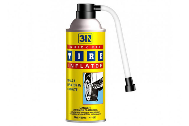 รถมอเตอร์ไซค์ส่วนมากไม่มี "ยางอะไหล่" หากเกิดการรั่วซึมของยางอาจต้องเข็นรถไปจนกว่าจะเจอปั๊มหรือร้านปะยาง 24 ชม. ถ้าต้องแบกล้ออะไหล่ก็ขับลำบากกินพื้นที่ ดังนั้นเพื่อความสะดวกและปลอดภัยนั่นคือ การใช้สเปรย์กระป๋องผสมน้ำยากันรั่วซึมสำหรับอัดลมเข้าไปในยางให้สามารถขับได้อีกชั่วคราวจนถึงร้านปะยาง กระป๋องสเปรย์กันรั่วซึมราคาอาจสูงหน่อย แต่เชื่อเถอะครับว่า...หากยางแบนกลางทางเปลี่ยวในที่มืดมันคุ้มมากจริงๆ