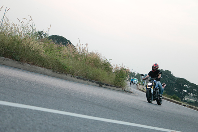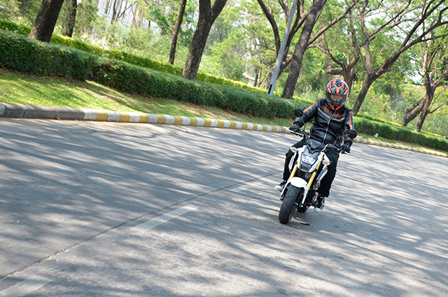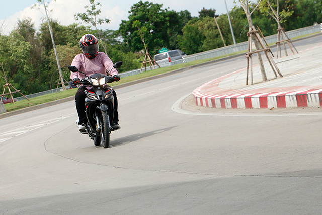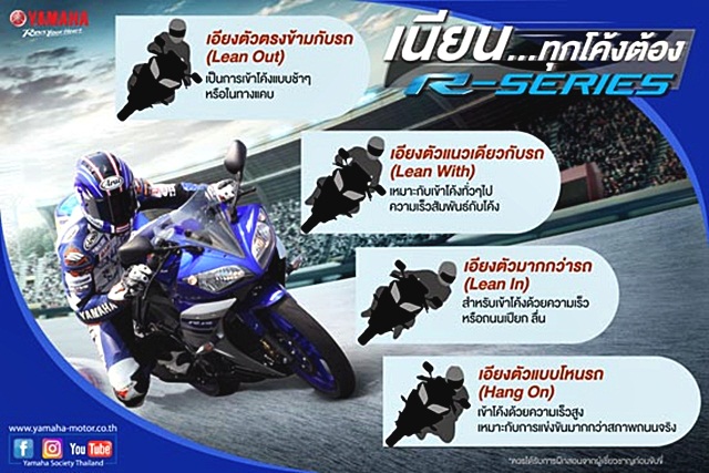 เอียงตัวมากกว่ารถ (Lean in) สำหรับการเข้าโค้งที่ความเร็วสูงๆ เพื่อให้มีจุดศูนย์ถ่วงต่ำและเกาะโค้งมากที่สุด
