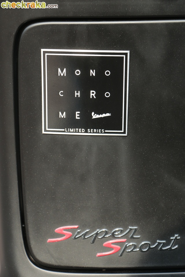เวสป้า GTS รุ่นพิเศษโมโนโครม ลิมิเต็ด ซีรีย์ โดดเด่นด้วยสไตล์และดีไซน์เรียบหรูจากโทนสีดำด้านทั้งคัน โดยมีอุปกรณ์ชุดแต่งเสริมความโฉบเฉี่ยวให้อารมณ์สปอร์ต เช่น ชิลด์บังลมแบบสั้น-สีดำสโมค, โลโก้ Vespa สีดำหน้ารถ, เบาะหนังดีไซน์ใหม่ และเพลทเหล็กโลโก้ Monochrome Limited Series ทำพิเศษสำหรับรุ่นนี้