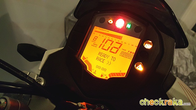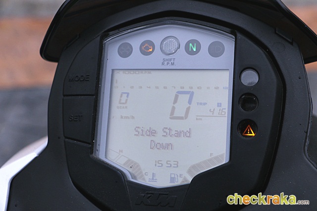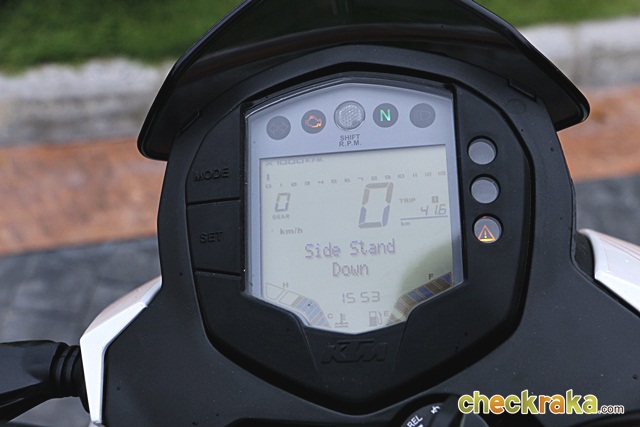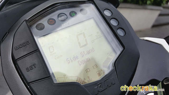 ความปลอดภัยของ KTM DUKE 390 ที่ได้ใช้งานจริงนั่นคือ ระบบเบรก ABS โดยเฉพาะสภาพถนนที่เปียกลื่นหรือมีฝุ่นทราย ABS ช่วยได้มากจริงๆ และยังมีครบทั้งล้อหน้า-หลัง นอกจากนี้บนหน้าปัดมีไฟเตือนเมื่อกางขาตั้งลง, เตือนให้นำรถเข้าศูนย์เช็คระยะ ไฟบอกสถานะระบบ ABS และยังสามารถกดปิดระบบ ABS ได้ในกรณีที่จำเป็นต้องขับขี่ในสไตล์โหดๆ แต่ก็ไม่แนะนำให้ปิดนะครับ และก็ไม่ต้องกังวลเพราะเมื่อดับเครื่องยนต์และสตาร์ตใหม่อีกครั้ง ระบบ ABS ก็จะกลับมาทำงานโดยอัตโนมัติ