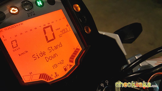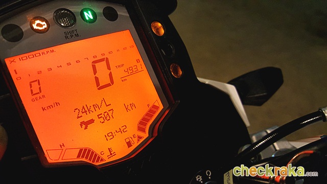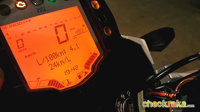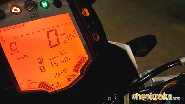 มาตรวัดแบบดิจิทัลจอแสดงผล LCD บอกความเร็วรอบเครื่องยนต์สูงสุดถึง 13,000 รอบ/นาที พร้อมข้อมูลต่างๆ เช่น ระยะทางทริป A และ B, เตือนเช็คระยะเข้าศูนย์ฯ, ระยะทางที่วิ่งได้จากน้ำมันคงเหลือ, อัตราสิ้นเปลืองเฉลี่ย ทั้งแบบ Km/h และ L/100Km และระดับความร้อนกับน้ำมันในถัง โดดเด่นด้วยไฟสีส้มในเวลากลางคืน มาตรวัดนี้มีฟังก์ชันเตือนเมื่อกางขาตั้งลง ไฟโชว์สถานะ ABS และไฟเตือนเมื่อมีสิ่งผิดปกติ