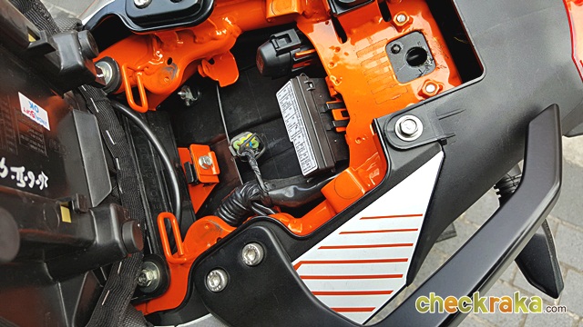 ช่วงล่างด้านหน้าโช้กหัวกลับ ด้านหลังสปริงสีขาวเด่นกระบอกโช้กเดียว ชุดท่อไอเสียขดม้วนเข้าด้านในและไปสู่หม้อพักใต้เครื่องยนต์