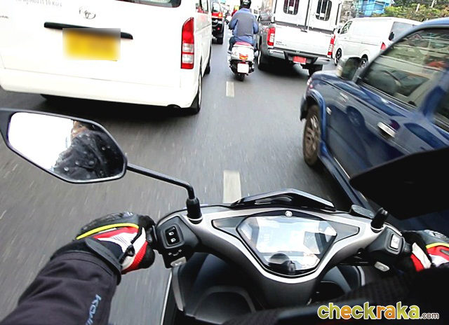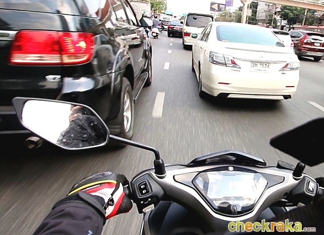 ความคล่องตัวไม่แพ้รถขนาดเล็กๆ ทำให้สามารถลัดเลาะตามช่องแคบระหว่างรถยนต์ได้อย่างสบายๆ ครับ ระดับกระจกข้างกับแฮนด์ก็ไม่เป็นปัญหาเมื่อขับผ่านกระจกมองข้างรถยนต์ นับว่าใช้งานในการจราจรหนาแน่นได้สะดวกคล่องตัวไม่น้อย