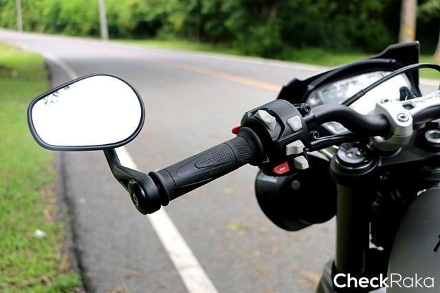 กระจกมองข้างตรงตำแหน่งปลายแฮนด์ ให้มุมมองที่กว้างและชัดเจน แต่ถ้าขี่เข้าเมืองเจอรถติดก็ต้องระวังหน่อย